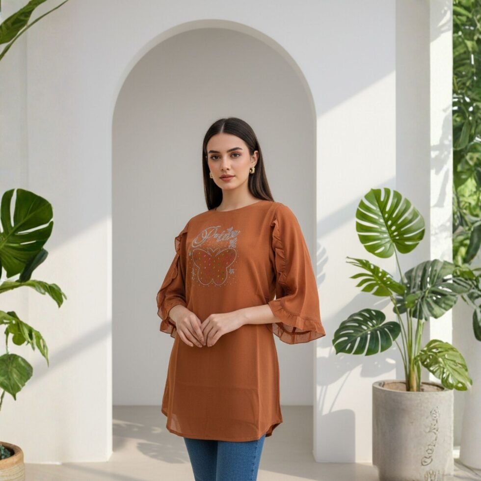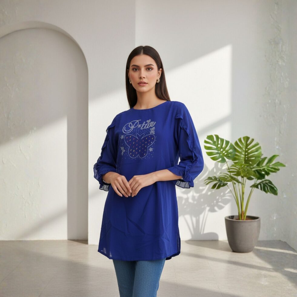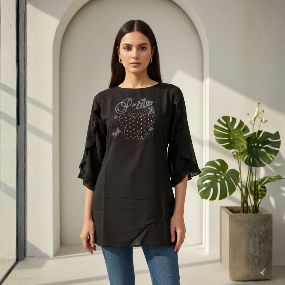Premium casual top featuring a stunning multi-colored rhinestone butterfly and “P-tär” motif. Designed with elegant ruffled bell sleeves and a comfortable, flattering fit. Perfect for high-end casual and semi-formal wear. Available in multiple rich color variations