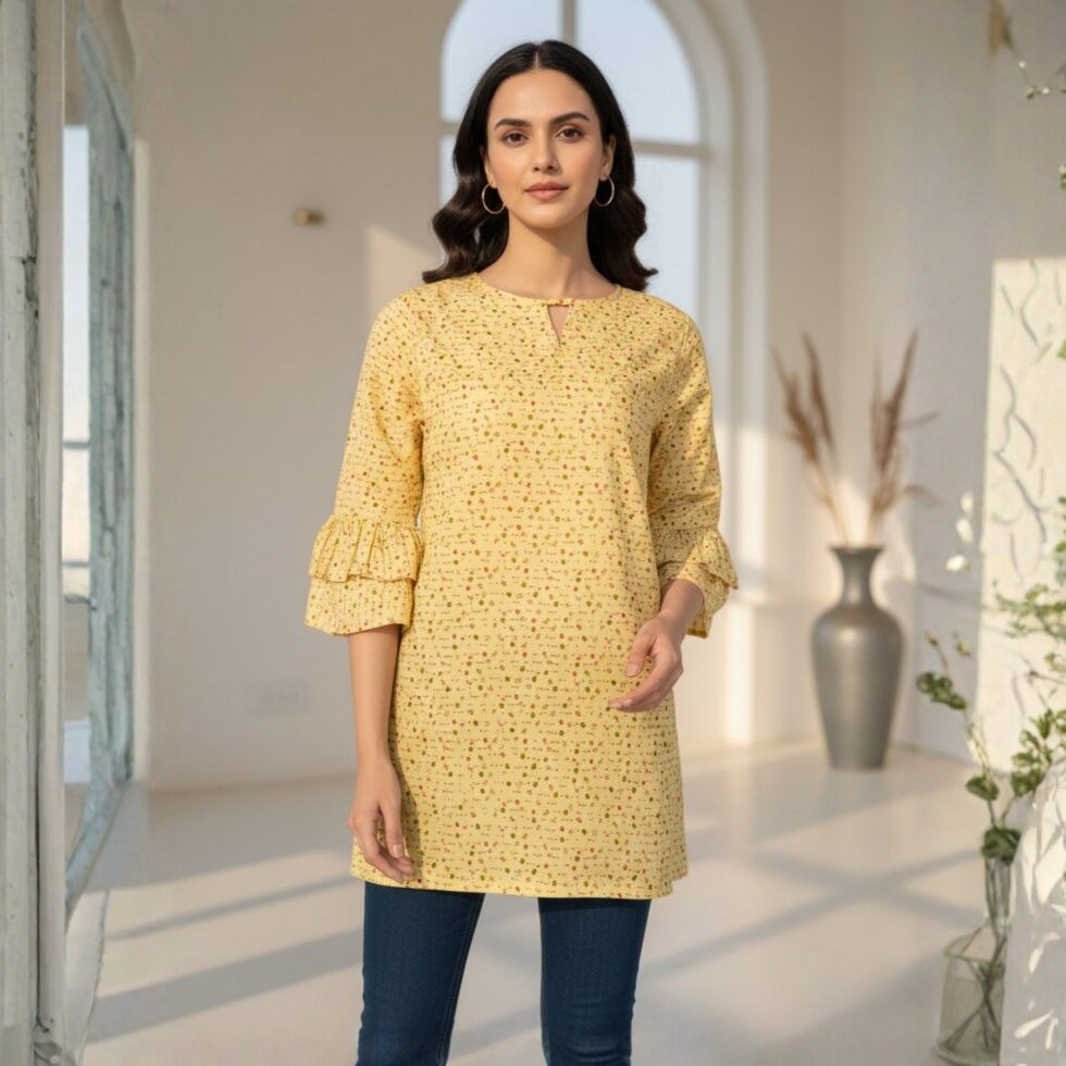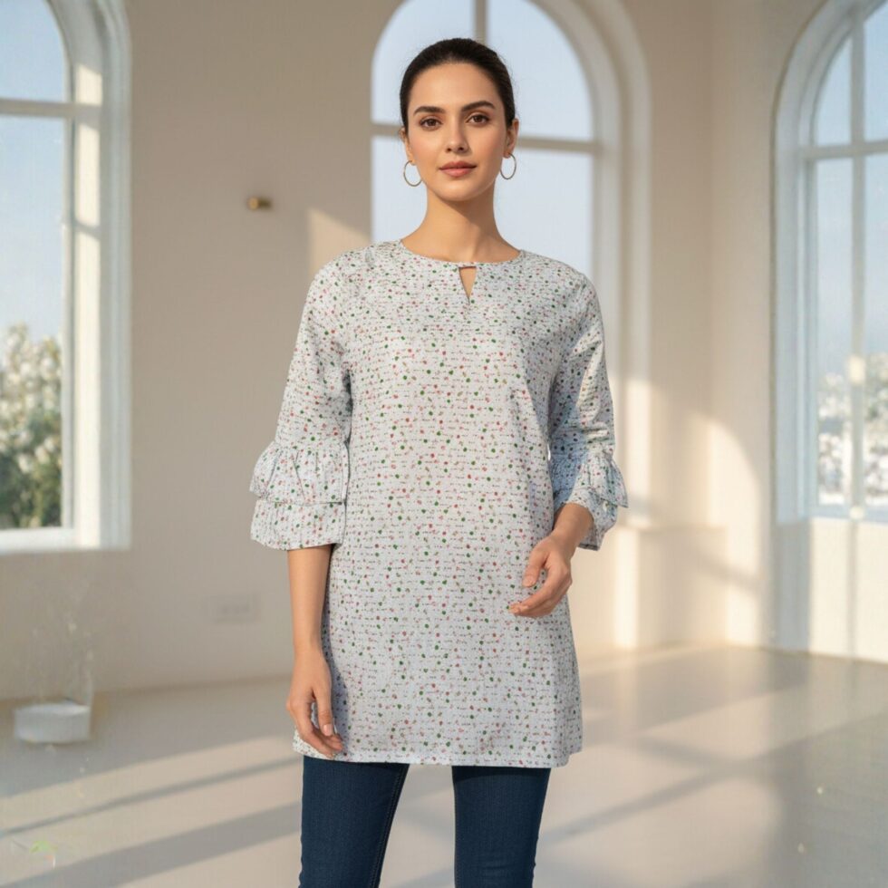 Sophisticated three-quarter ruffle sleeve tunic top with a keyhole neckline and an all-over micro-print. Crafted from a premium lightweight fabric for a comfortable, flattering fit. Perfect for high-end casual and semi-formal wear. Available in multiple exclusive color variations.
