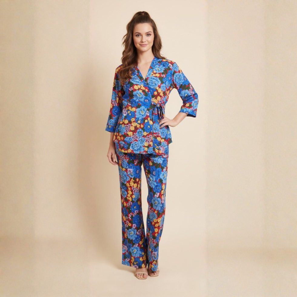 Indulge in ultimate comfort and style with our Premium Floral Print Women’s Pajama Set. Designed for sophisticated relaxation, this luxurious 3-piece loungewear set (top, pants, and tie-belt) seamlessly blends soft, breathable fabric with vibrant, eye-catching floral patterns.