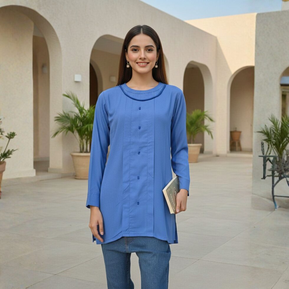Elegant women’s long-sleeve pleated tunic shirt featuring a beaded round neckline and a full front placket with matching buttons. Long-line cut, premium fabric, and available in multiple rich colors. Perfect for smart-casual and professional wear.