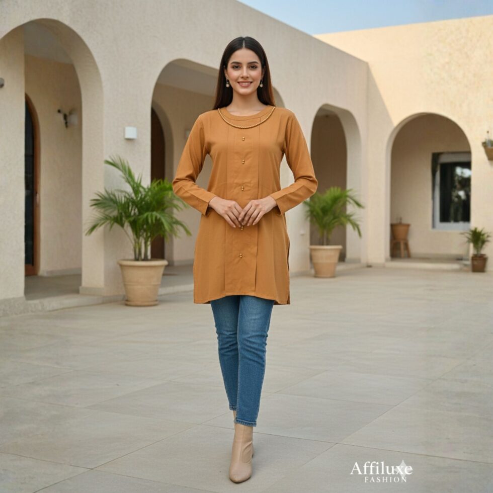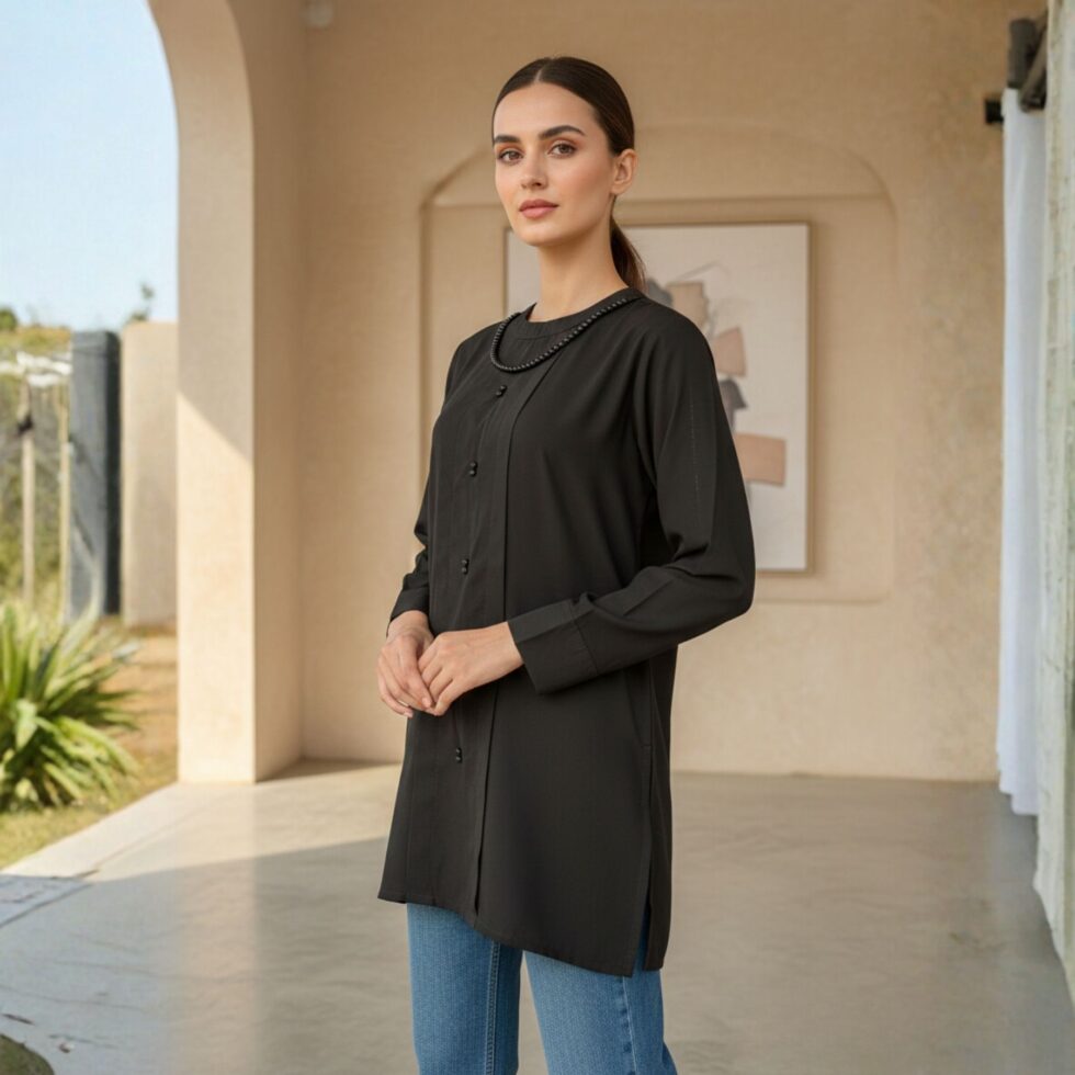 Introducing the ultimate essential for the modern woman’s wardrobe: the Pleated Tunic Shirt. This exquisite piece blends classic tailoring with contemporary elegance, offering a versatile silhouette perfect for professional settings, casual outings, or weekend wear. Designed for the high-end women’s clothing market, this tunic exemplifies quality craftsmanship and sophisticated style.